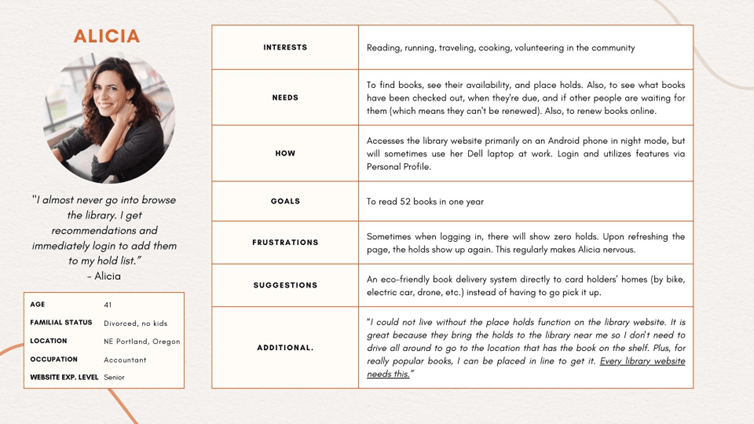 - These personas represent the FVRL patron and helped guide further steps such as the content analyses of the current FVRL website which then structured site maps and redesigns through wireframes.