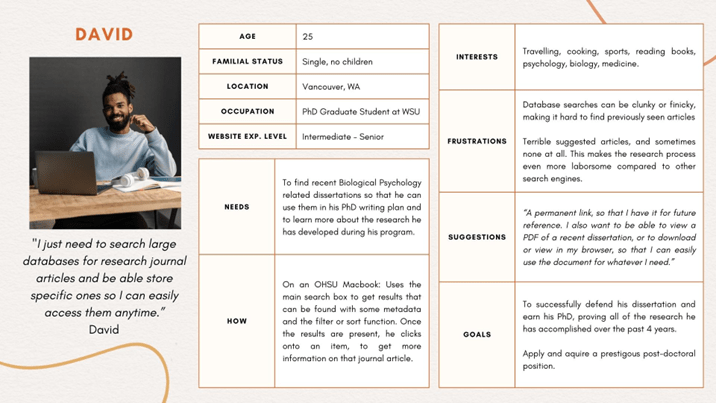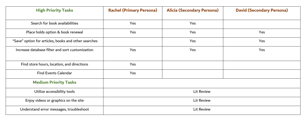 Based on user interviews, literature review, and observed patron behavior, three personas were created: Emily the full-time mom, Alicia the bookworm accountant, and David the time-strapped PhD candidate. These personas reflect key user demographics, goals, common tasks, and the types of information they seek to accomplish those goals.